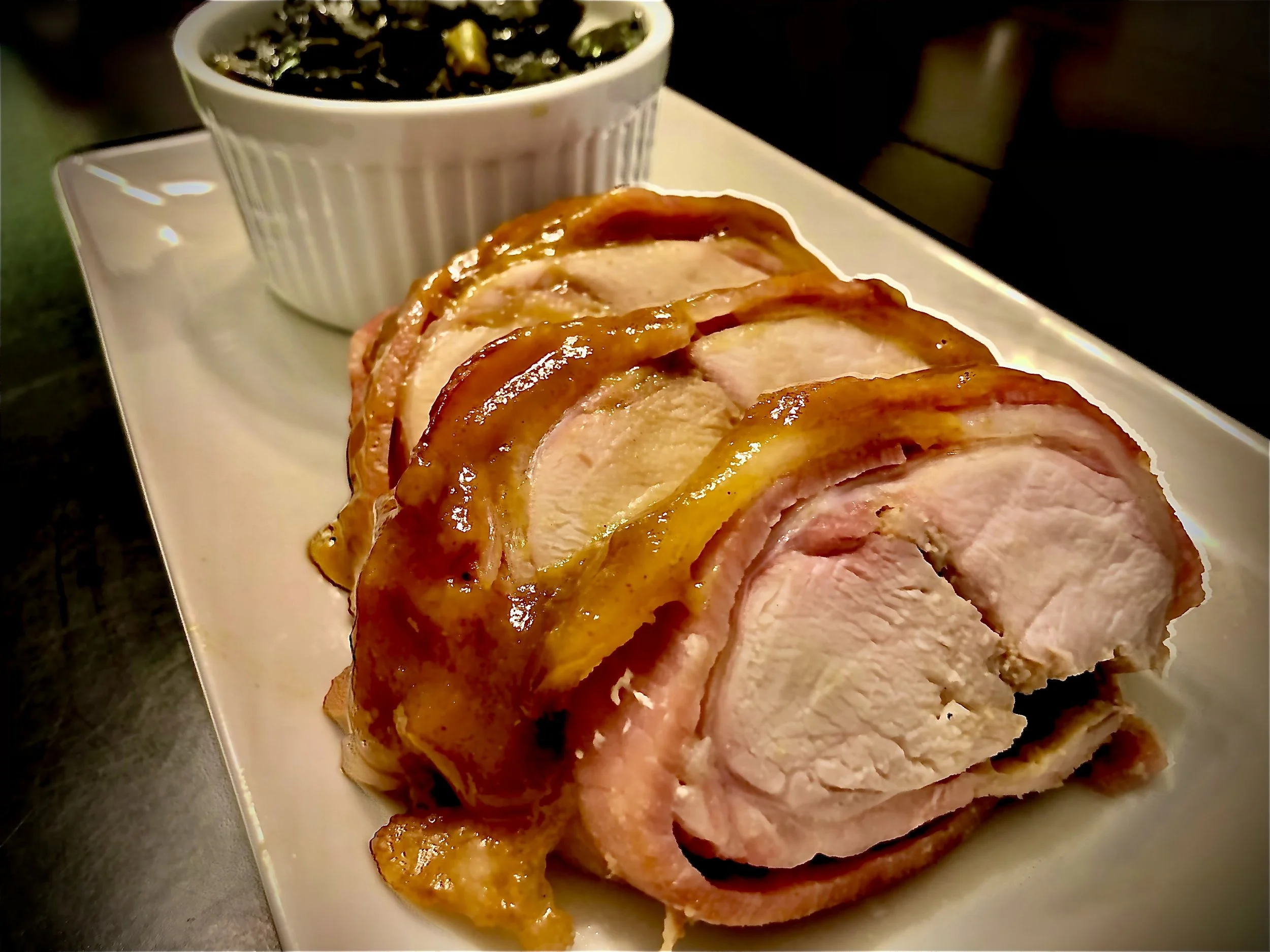 This delicious arrangement dresses a deboned saddle with brown sugar, Dijon mustard, and bourbon then wraps it in bacon for a slow cook in the smoker. Finished with a glaze and paired with Southern style collard greens, this dish is an instant favorite.