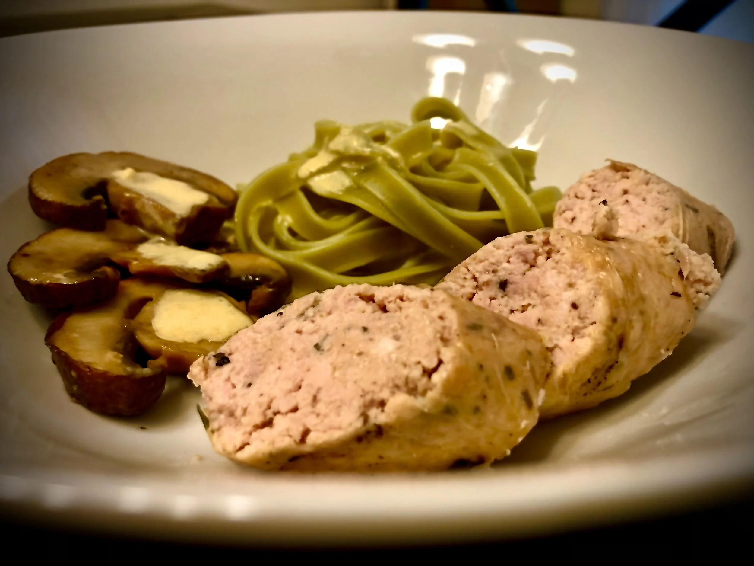 Rabbit Sausage, Spinach Tagliatelle & sautéed Portobello
