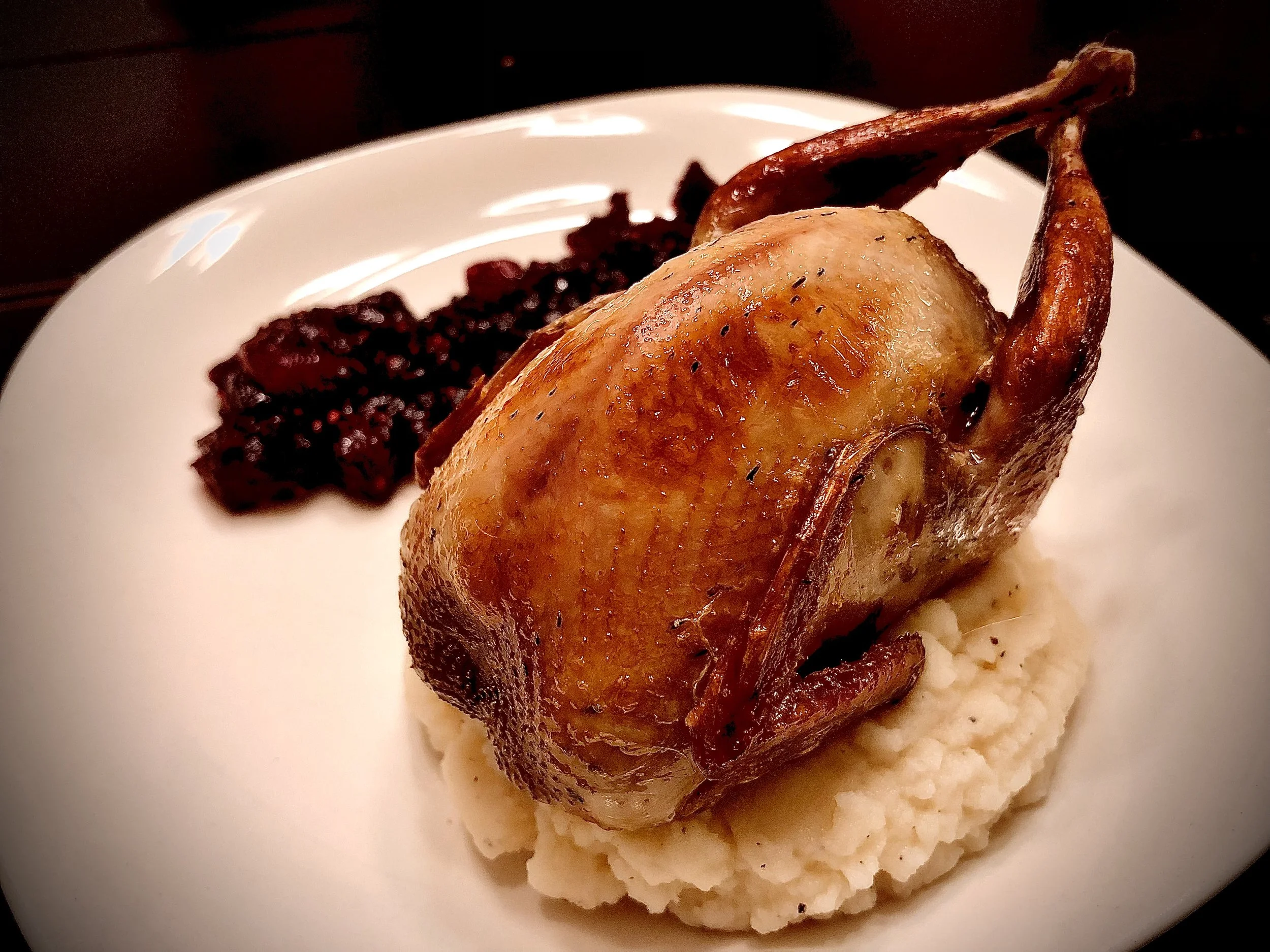 Simple, but delicious! The sweetness of golden raisins soaked in dry sherry cooked over flame in a spatchcock quail and served with sage and caraway seeds over shredded cabbage.