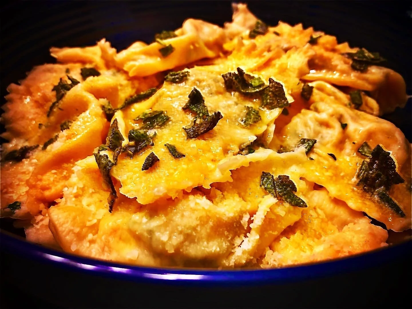 A traditional Italian pasta dressed in brown butter and fresh sage. The filling combines sautéed spinach, minced rabbit, and vegetables with ricotta cheese and parmigiana.